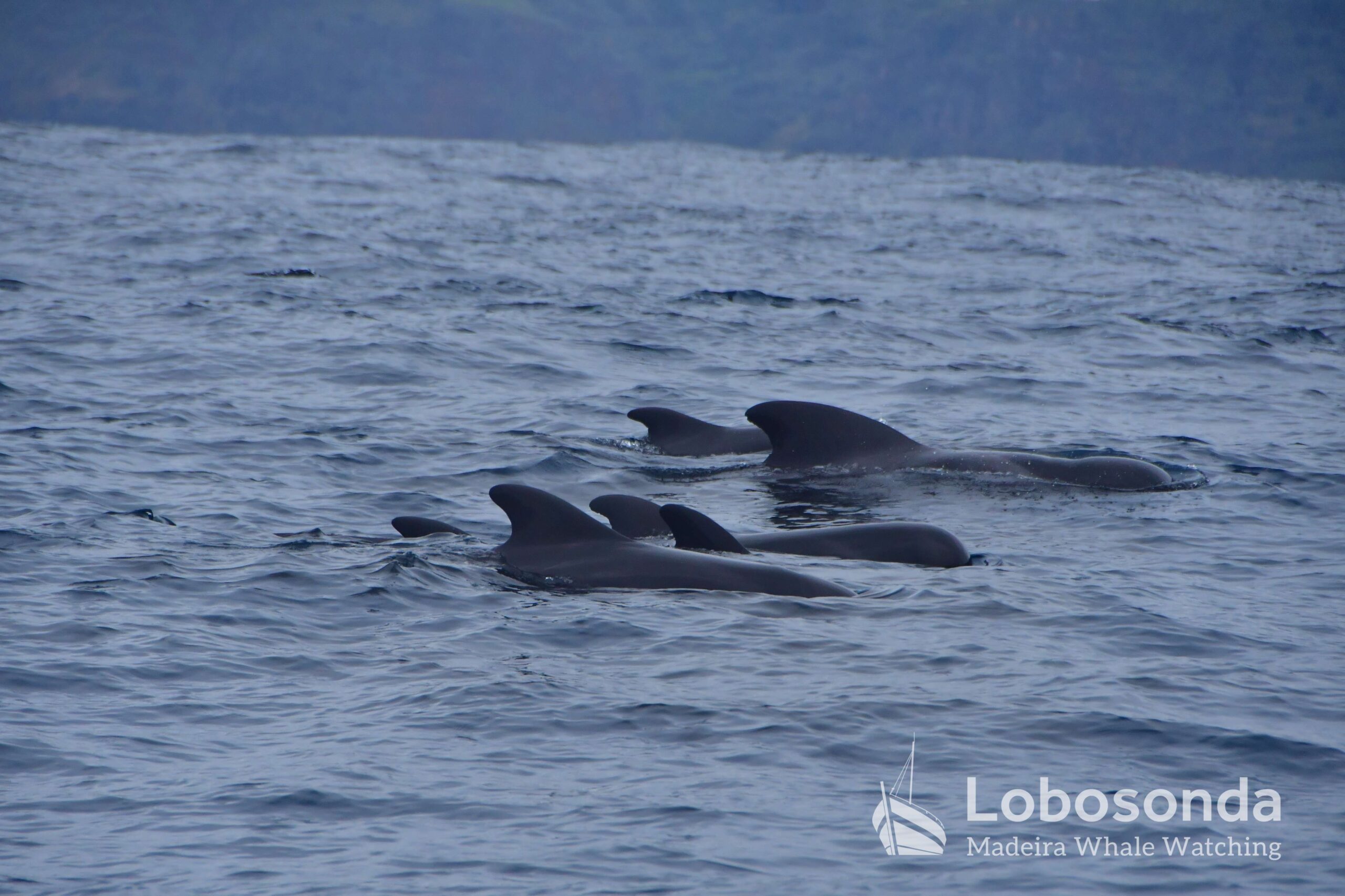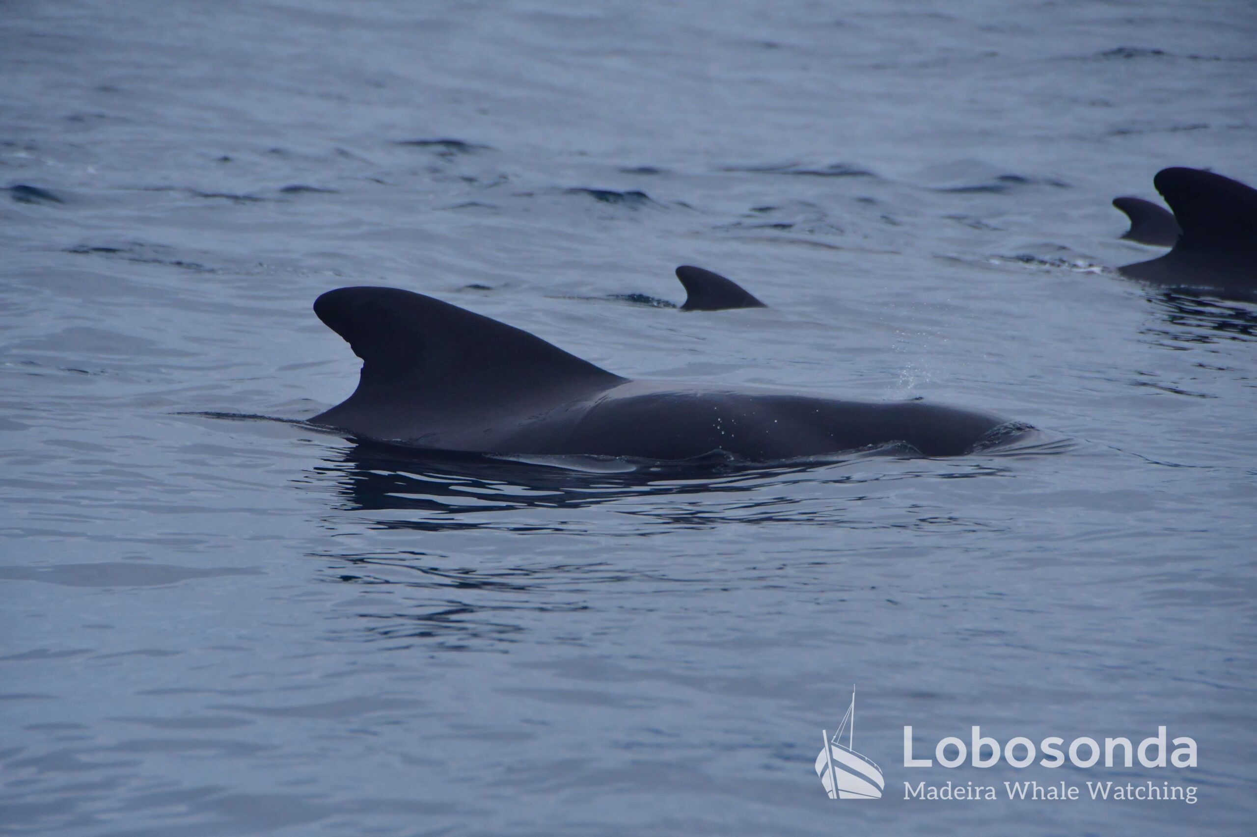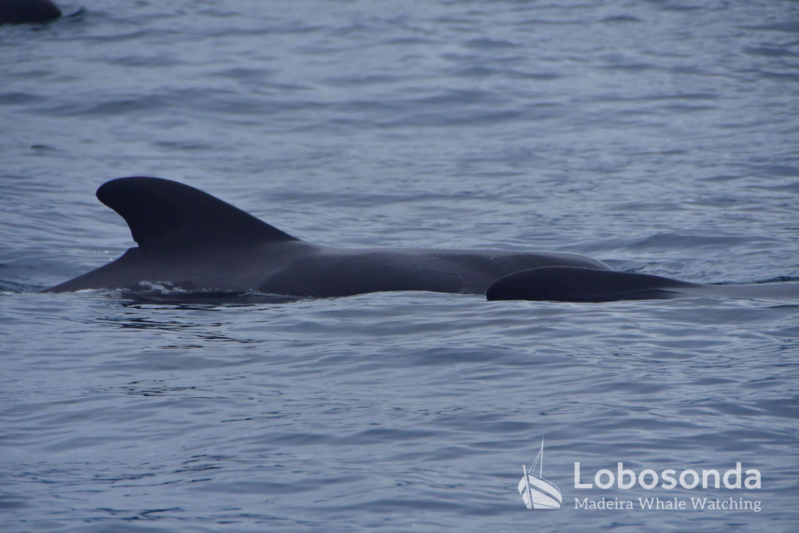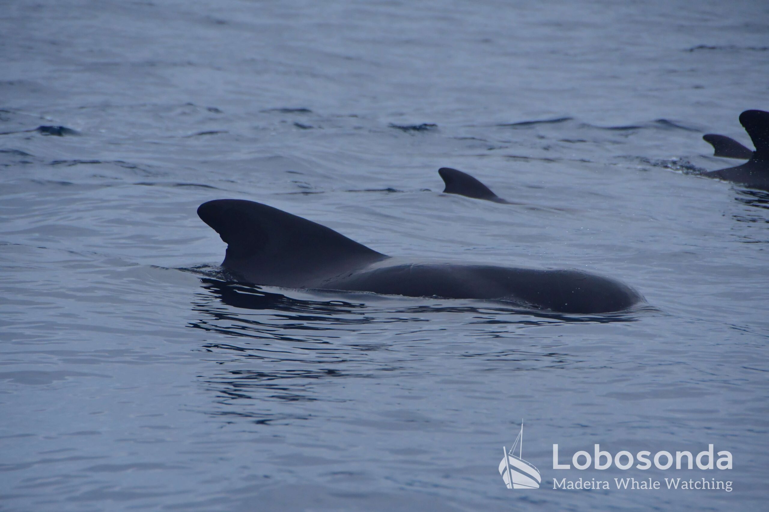 The overcast skies over Calheta and the Southwestern waters sure didn’t dim the mood at sea today! A 3m swell creased the grey Atlantic Ocean but soon the contrast of a few dorsal fins broke the surface and we all knew it was going to be a good day. Bottlenose dolphins (Tursiops truncatus), their grey skin almost without contrast to the grey waters, were travelling east as a unit. A few of the pods individuals even took the time to engage in a brief bow-ride and soon our captain veered east to go and see some Short-finned pilot whales (Globicephala macrorhynchus).