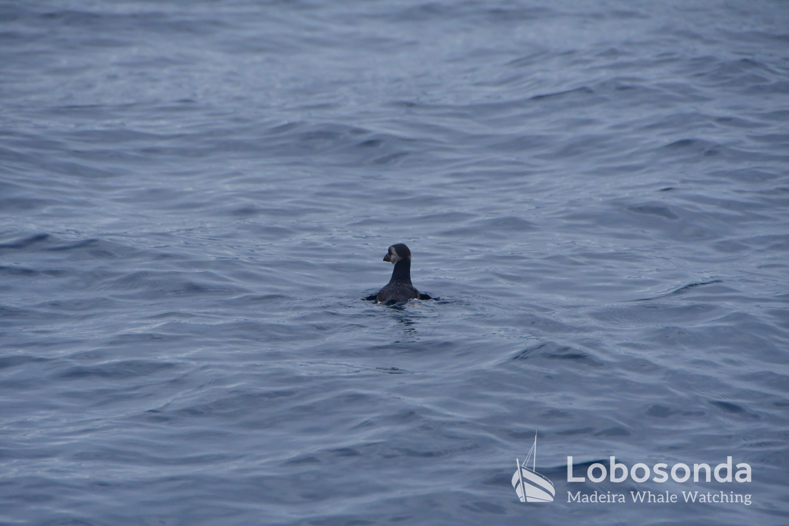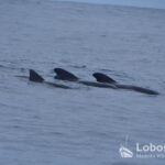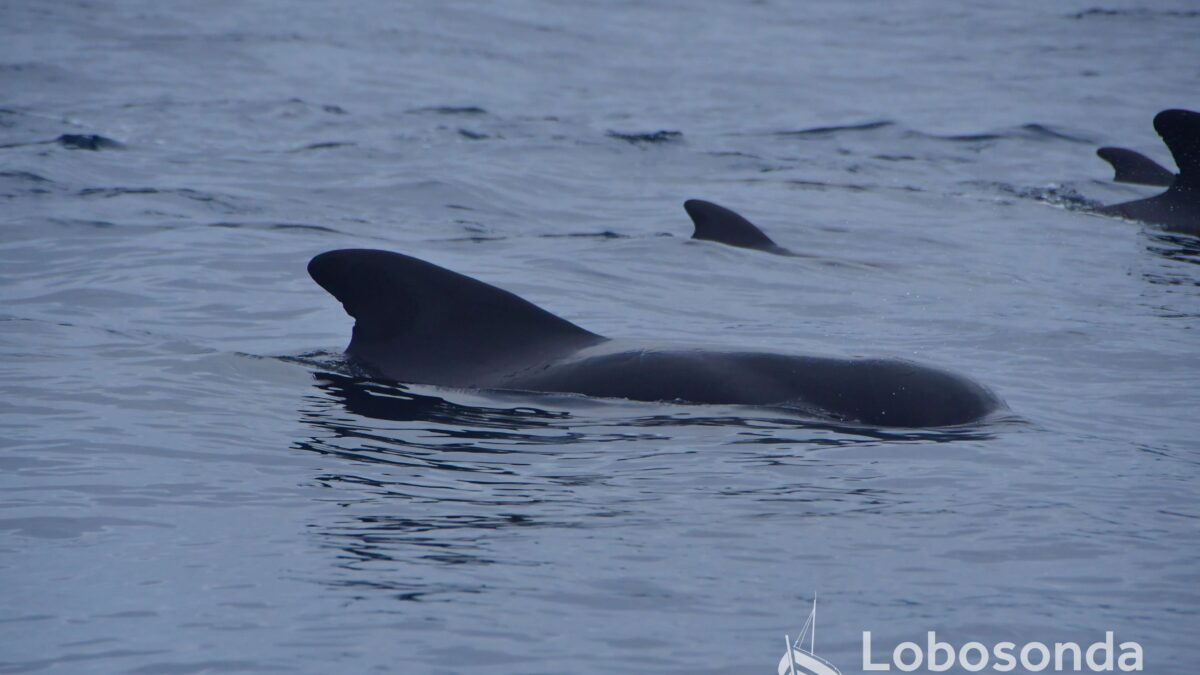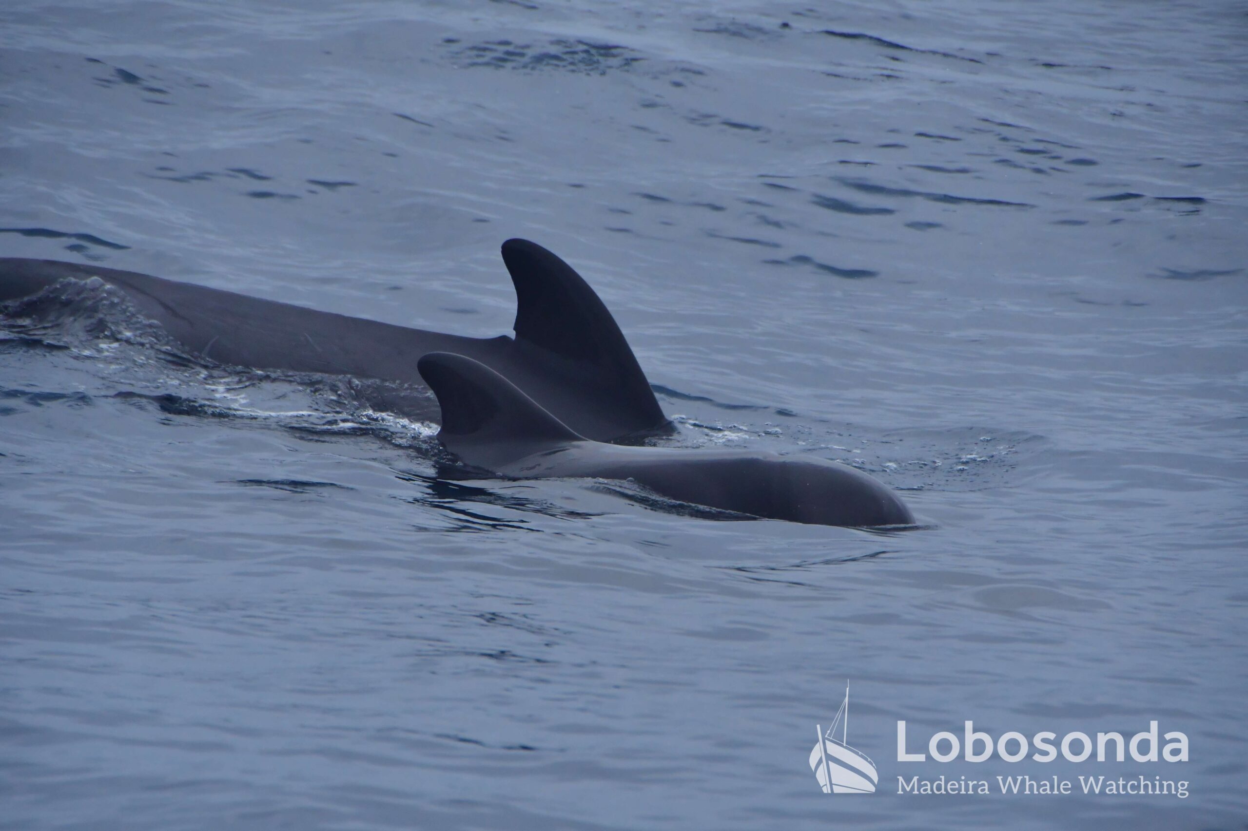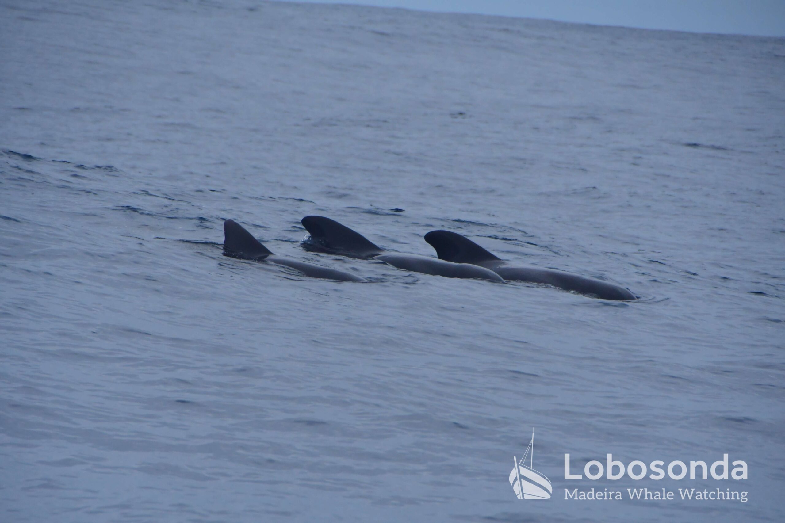 The overcast skies over Calheta and the Southwestern waters sure didn’t dim the mood at sea today! A 3m swell creased the grey Atlantic Ocean but soon the contrast of a few dorsal fins broke the surface and we all knew it was going to be a good day. Bottlenose dolphins (Tursiops truncatus), their grey skin almost without contrast to the grey waters, were travelling east as a unit. A few of the pods individuals even took the time to engage in a brief bow-ride and soon our captain veered east to go and see some Short-finned pilot whales (Globicephala macrorhynchus).