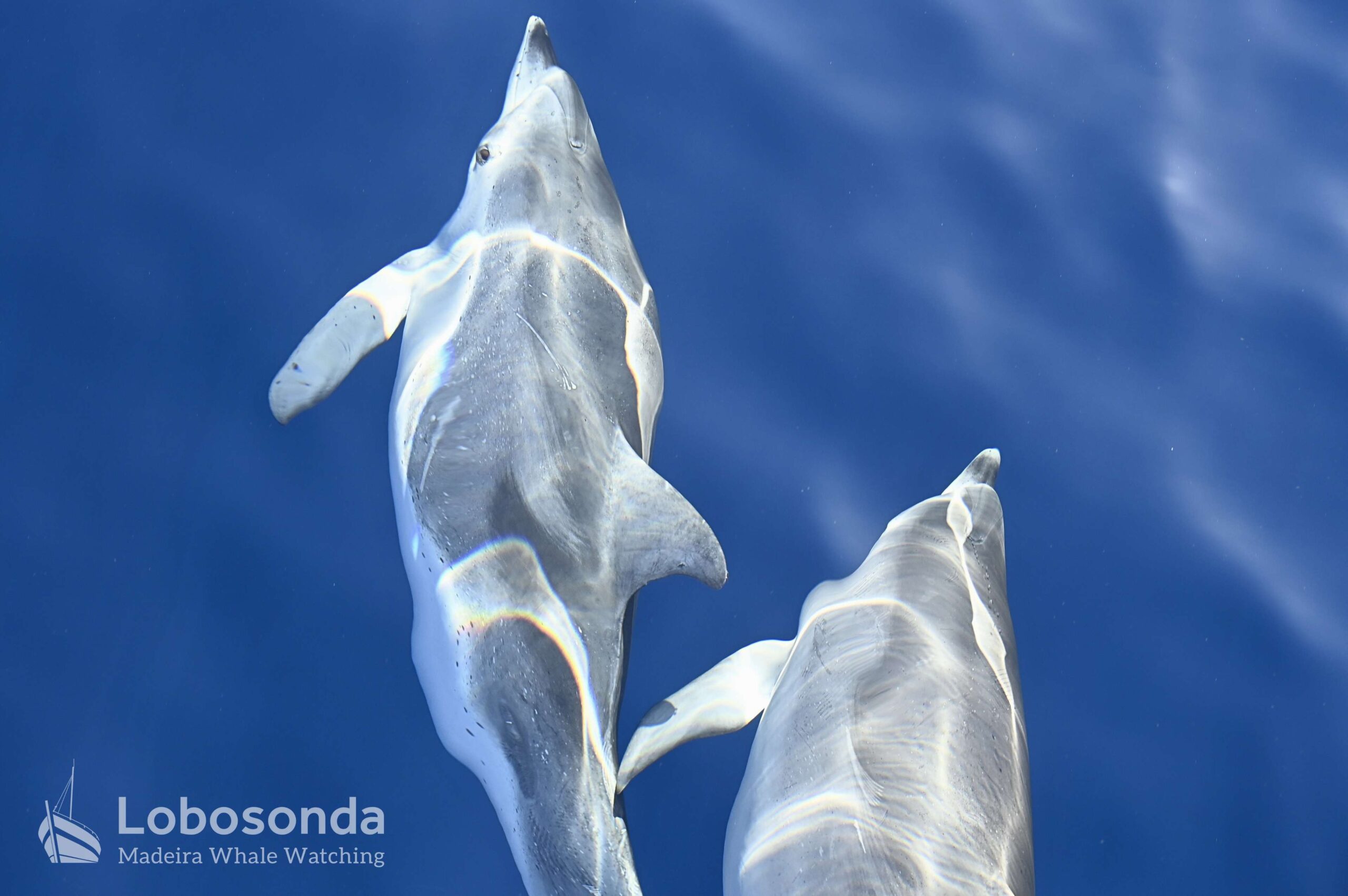 This December, we found more waves on our tours than our friends in the blue office. On many tours, we returned without sightings. But today we were lucky. Three different marine mammal species showed themselves to us. Even our summer dolphins, the Atlantic spotted dolphins (Stenella frontalis), were still here. On the way back, we encountered Short-finned pilot whales (Globicephala macrorhynchus) and Bottlenose dolphins (Tursiops truncatus), which were travelling together as they often do.