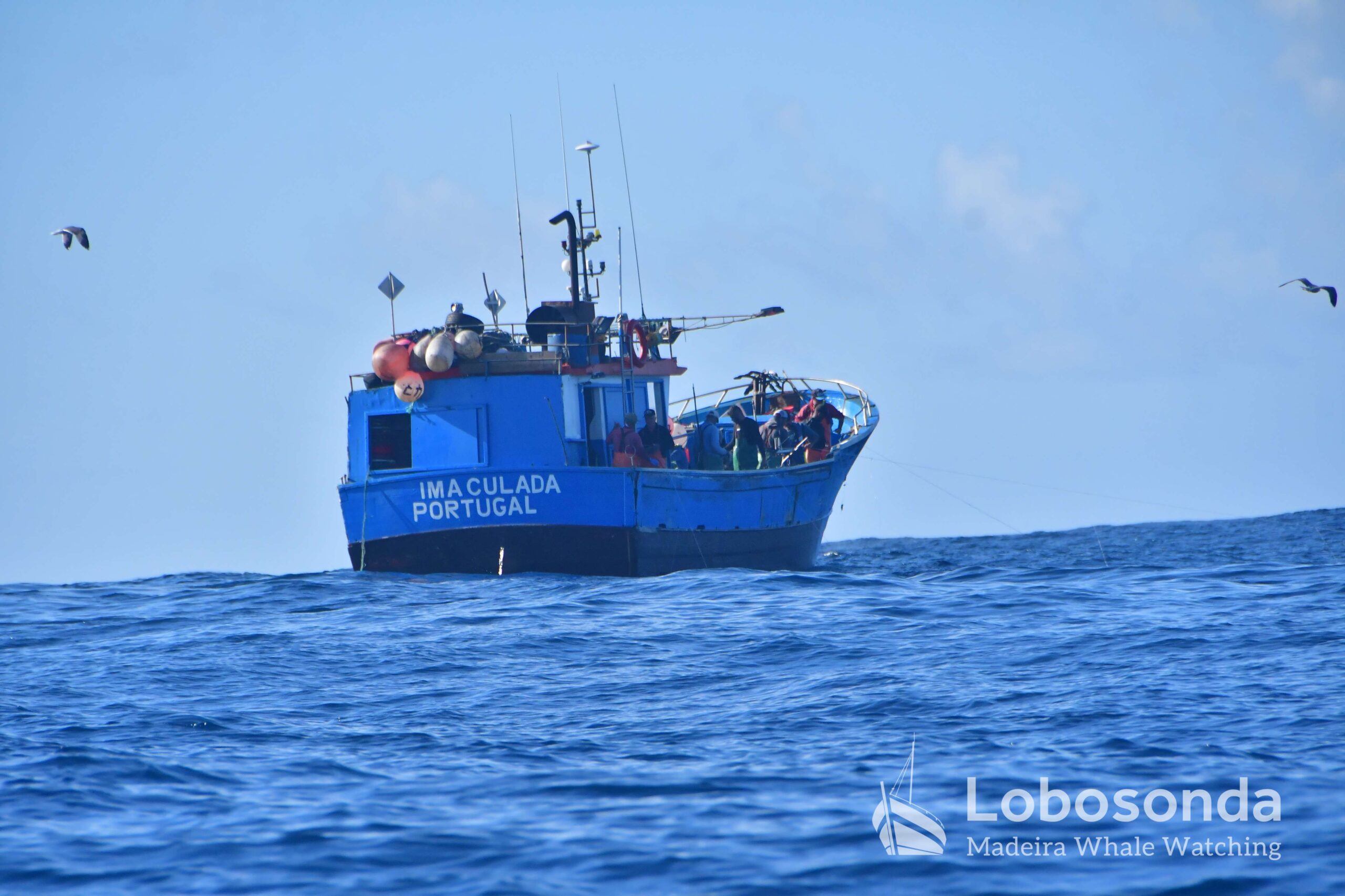 Weiter draußen hielten sich Große Tümmler (Tursiops truncatus) in der Nähe eines Fischerbootes auf, das seiner Arbeit nachging und damit indirekt für frischen Degenfisch auf den Tellern unserer Gäste sorgte.