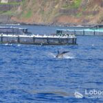 Die Fischfarmen sind mit Goldbrassen (Sparus aurata) gefüllt, einem beliebten Speisefisch, der natürlicherweise im Mittelmeer vorkommt und im Nordatlantik ausschließlich in Aquakulturen existiert. Während wir häufig Delfine und andere Räuber bei der Nahrungssuche rund um die Netze beobachten, hat ein jüngster Sturm diese Aktivität noch verstärkt, indem er eines der Netze aufriss und einen Schwarm Goldbrassen in den Atlantik entließ. Küstenfischer und Meeresräuber haben sich in der vergangenen Woche an diesen Fischen gütlich getan – darunter auch Große Tümmler.