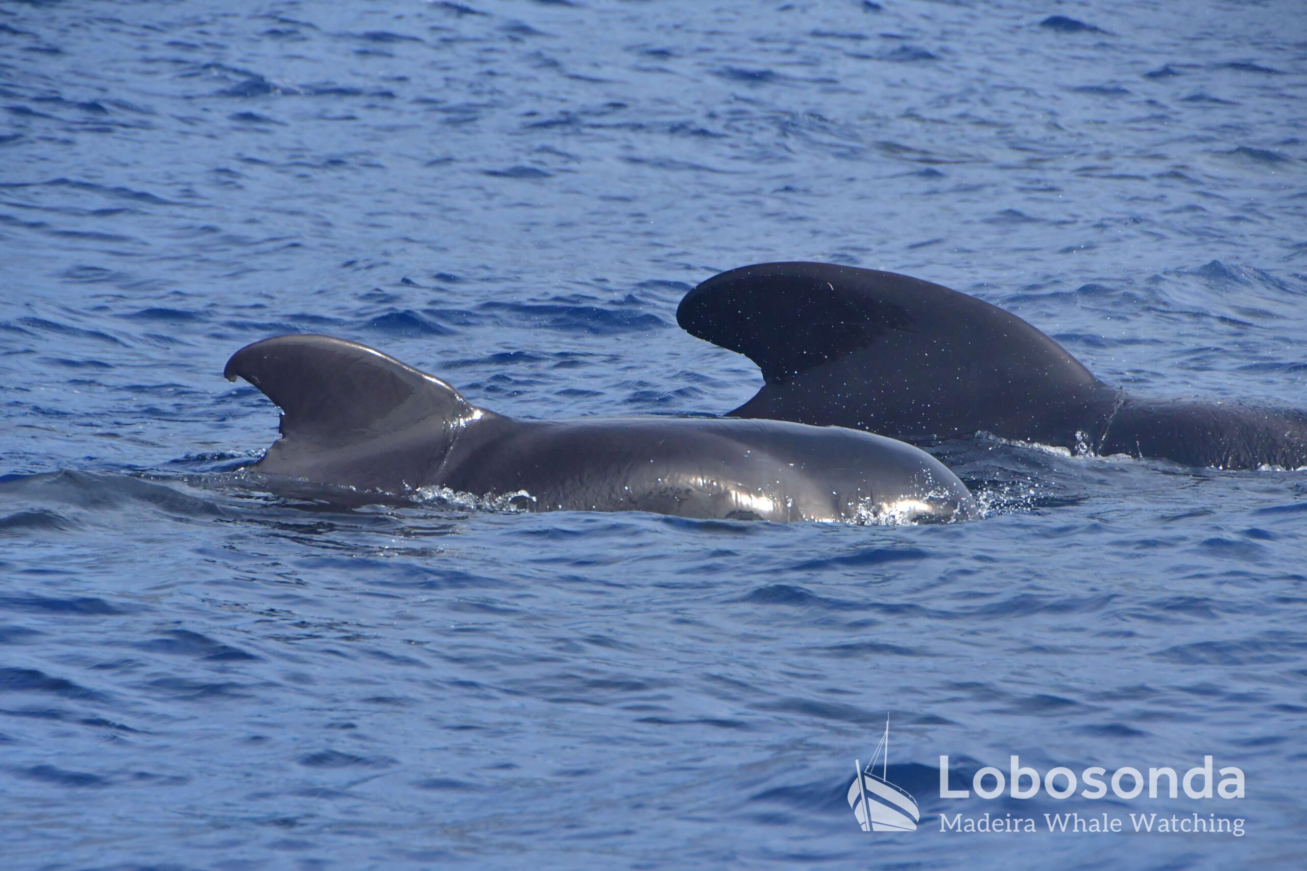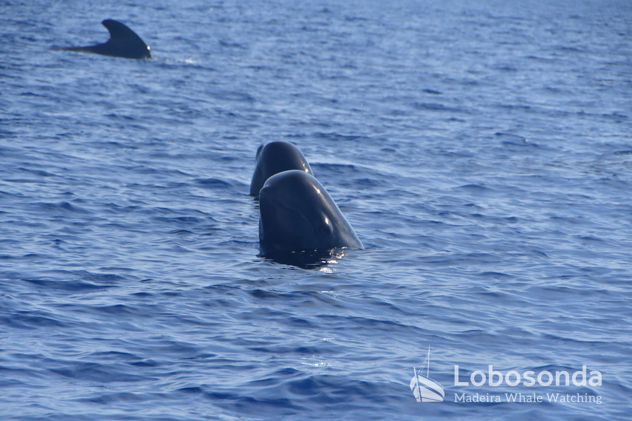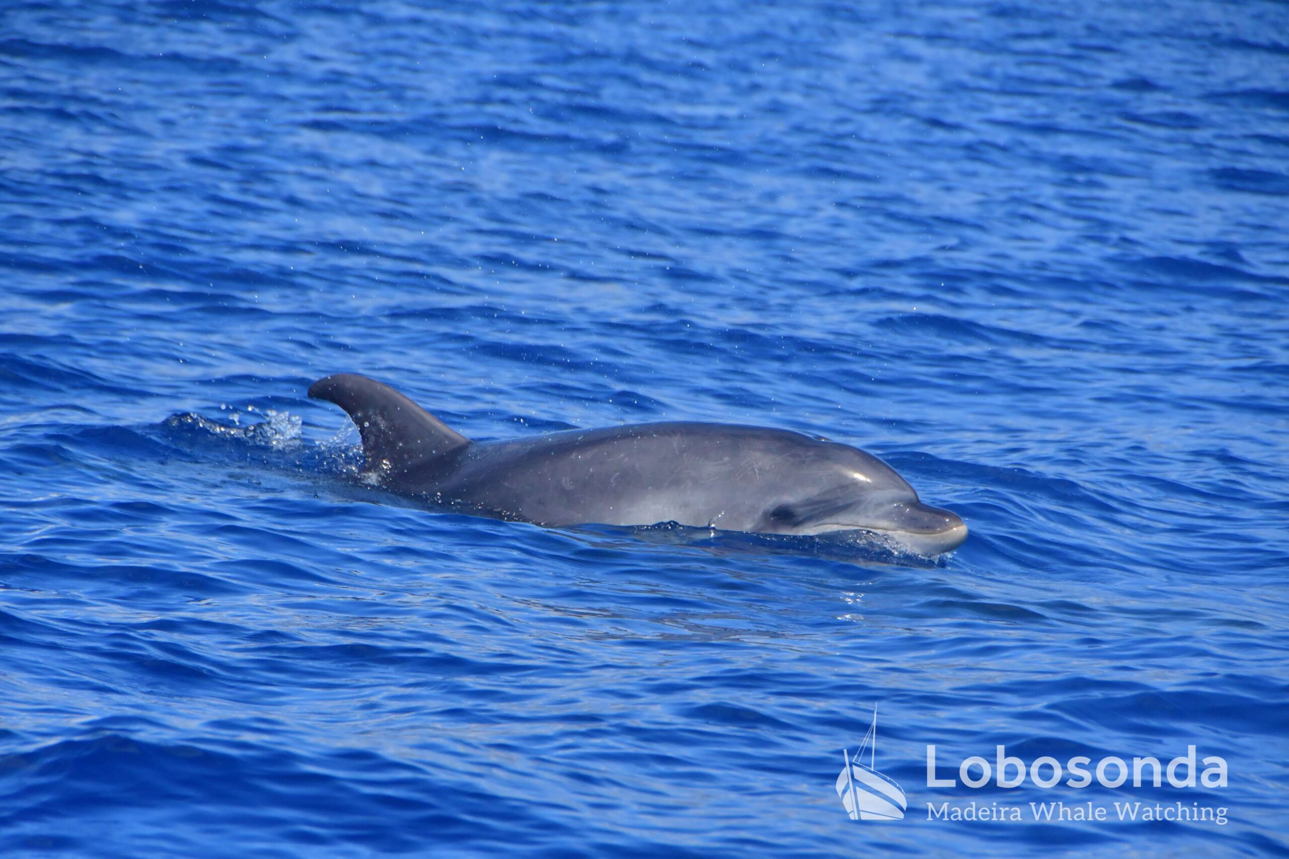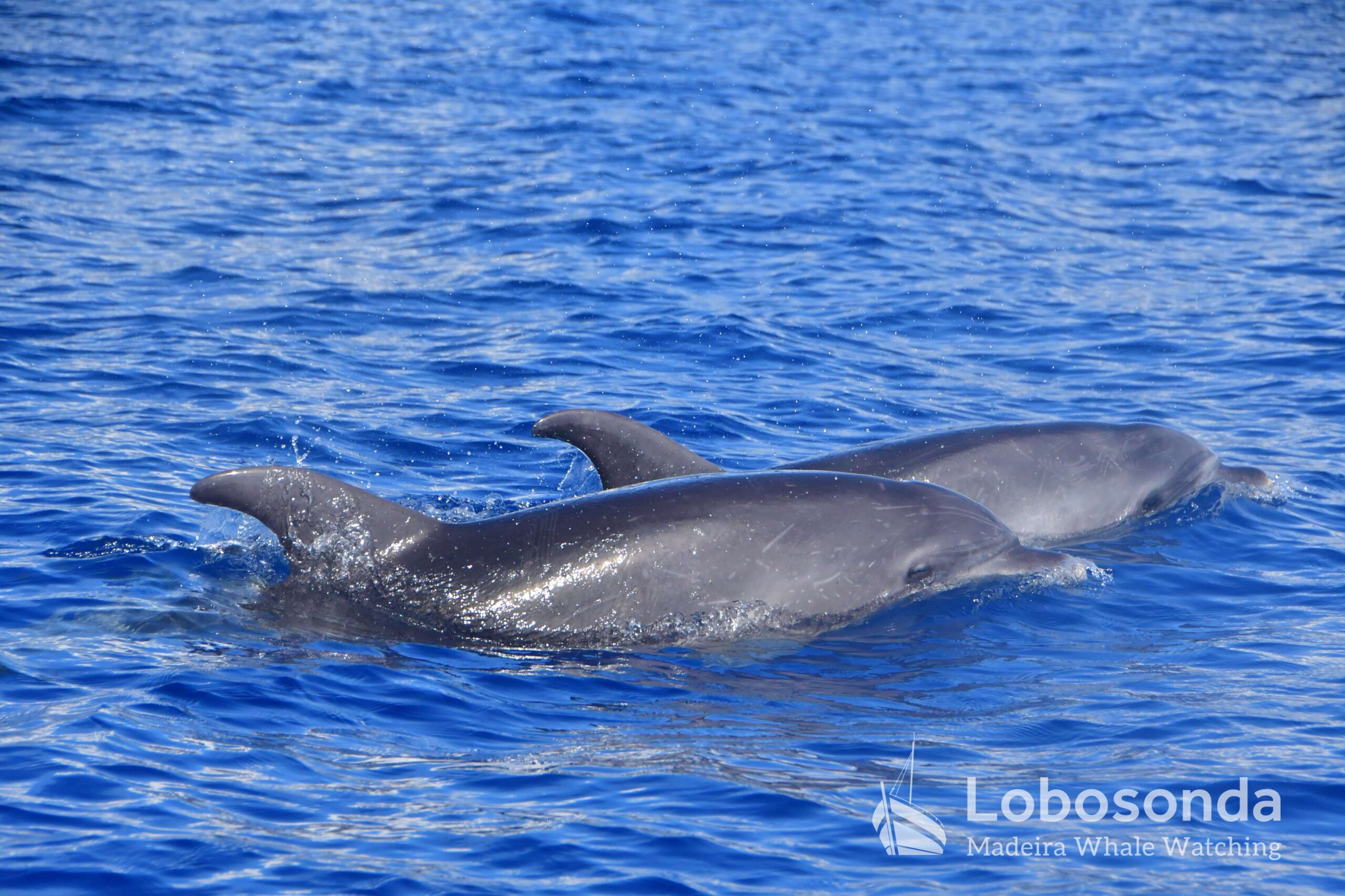 Diese sozialen Säugetiere passen ihr Verhalten häufig an andere Cetaceen an, indem sie deren Lautäußerungen und Bewegungen nachahmen. Heute Morgen beobachteten wir sie in der Nähe einer Familie Kurzflossen-Grindwale (Globicephala macrorhynchus) – einer friedlichen Art, die sich ihren Lebensraum mit der ansässigen Tümmler-Population Madeiras teilt. Oft imitieren die Tümmler sogar das Schwimmverhalten der Grindwale, sodass man sich gut vorstellen kann, wie es unter Wasser zugeht. Normalerweise halten sich Große Tümmler an die Regel „Ein Meeressäuger zurzeit“ und konzentrieren sich ganz auf die Interaktion mit ihren Artgenossen – uns schenken sie dabei meist wenig Beachtung. Heute jedoch kamen einige neugierig an unser Boot heran und verbrachten ruhig einige Momente am Bug.