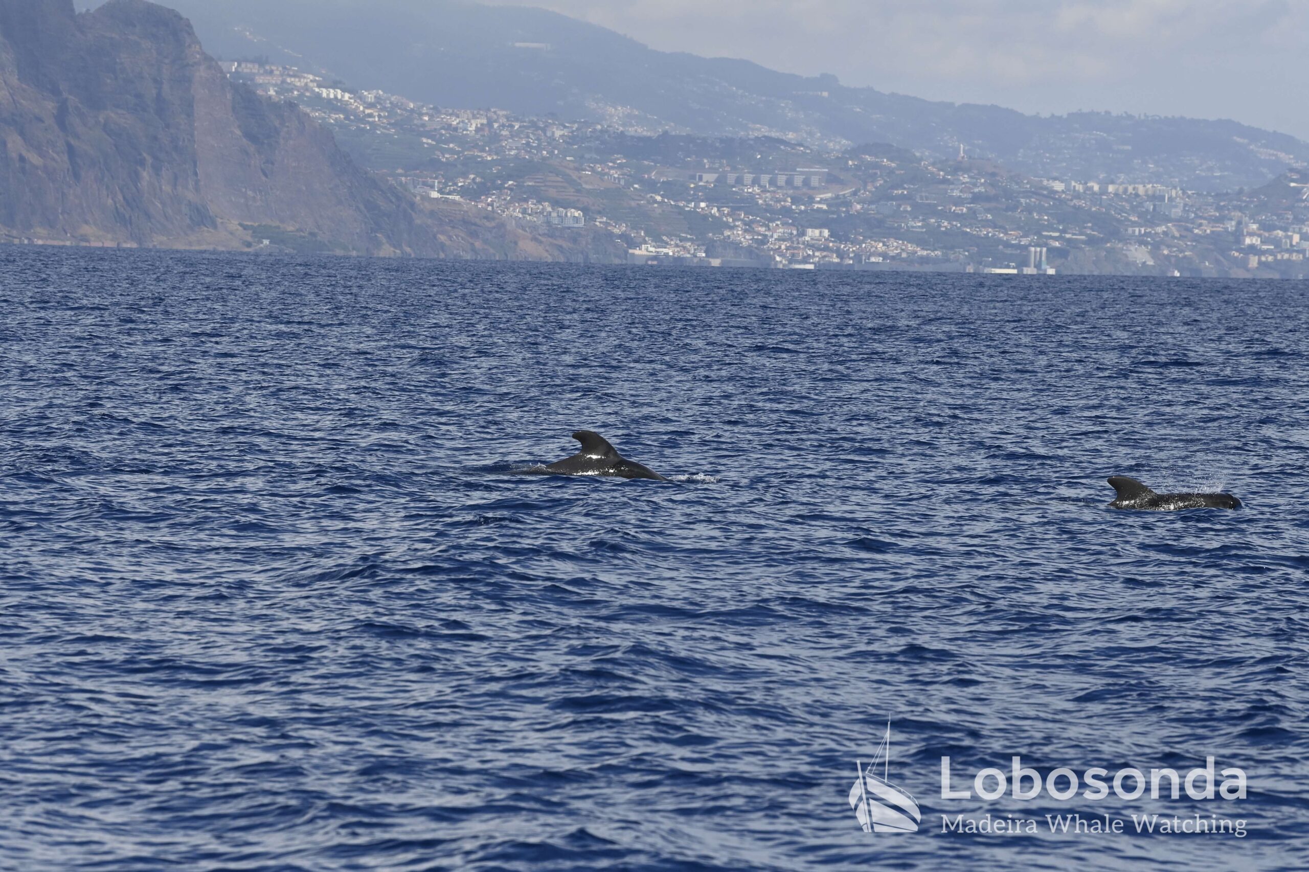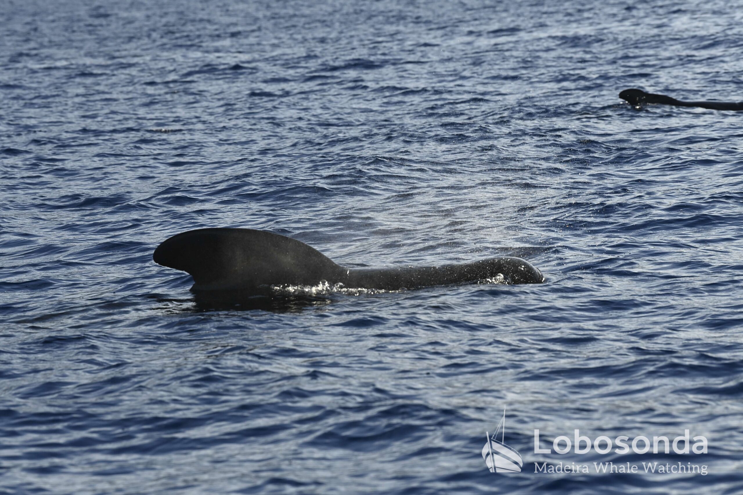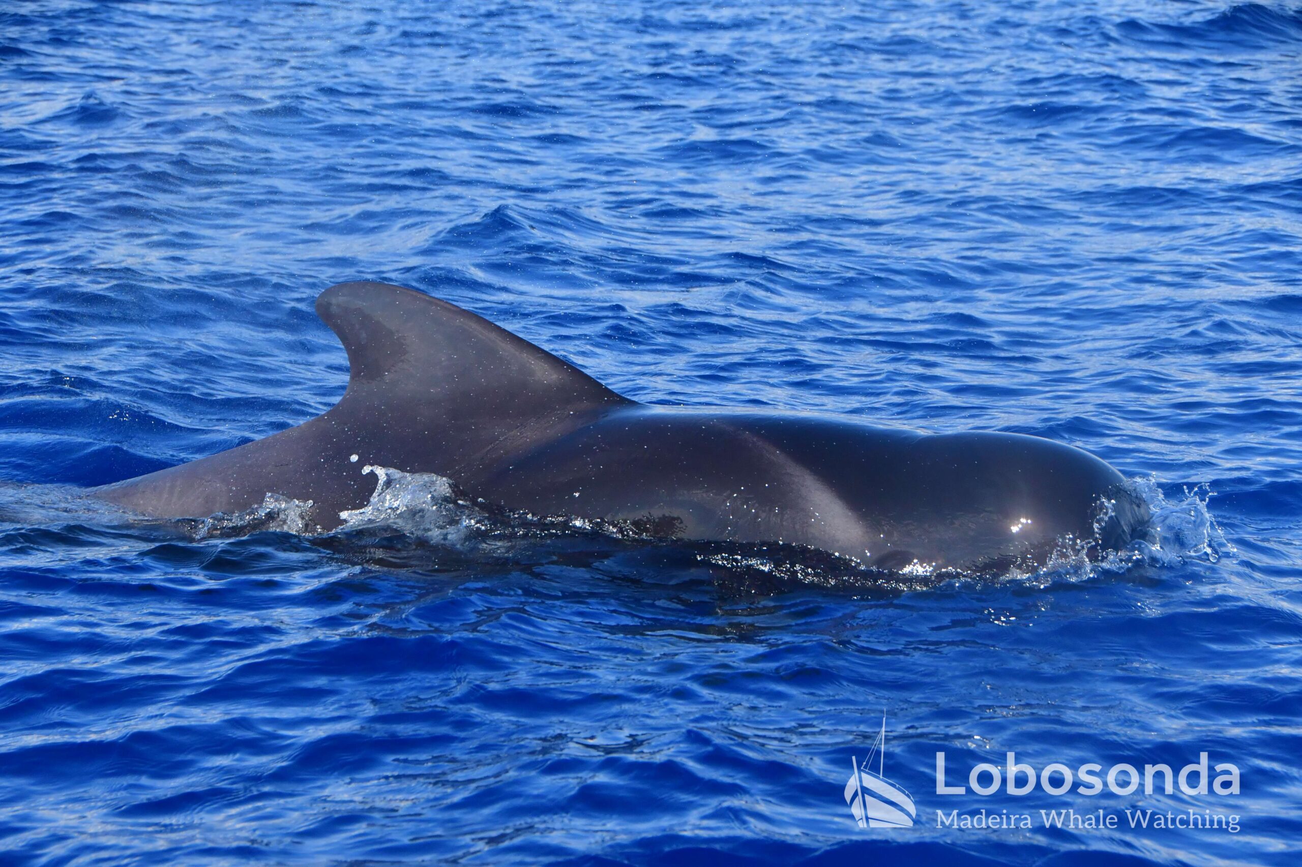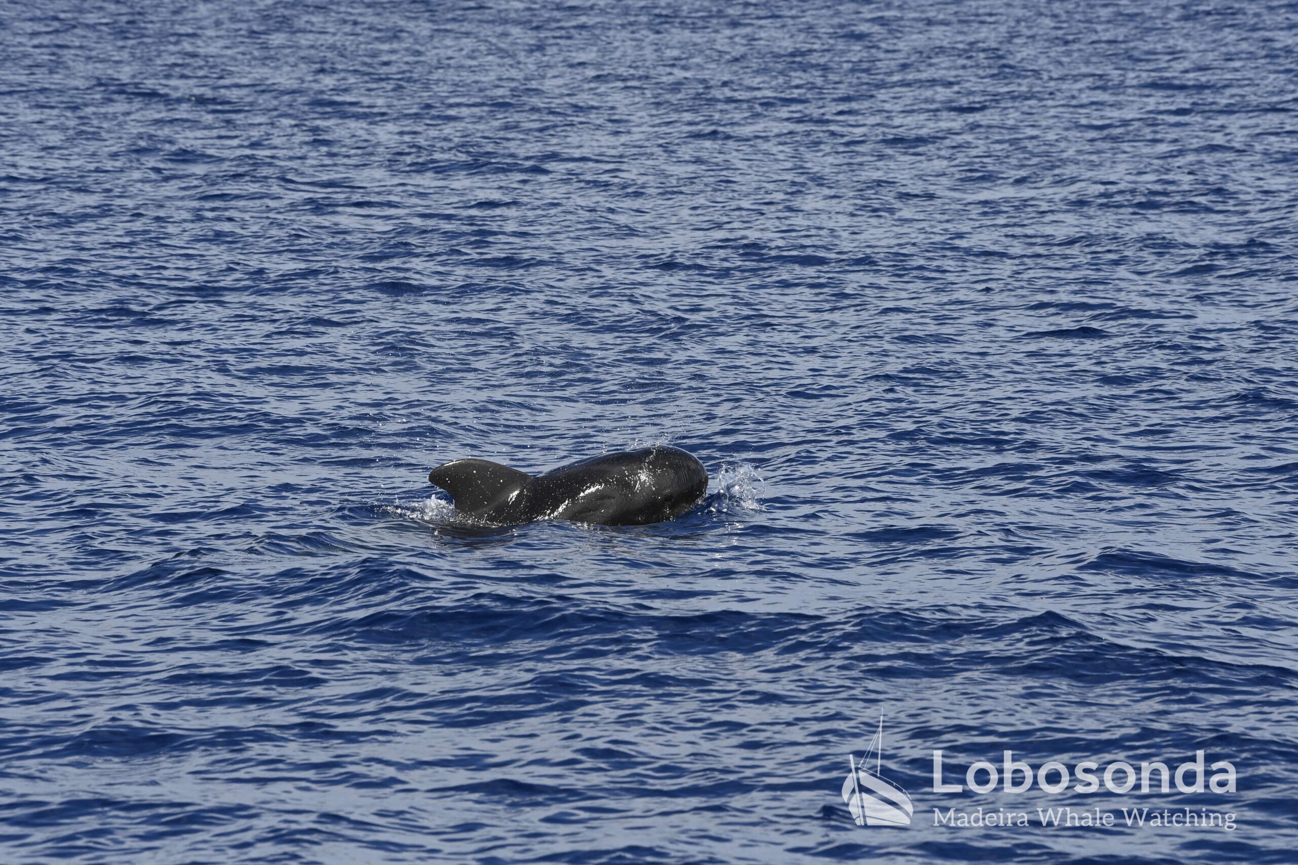 Diese sozialen Säugetiere passen ihr Verhalten häufig an andere Cetaceen an, indem sie deren Lautäußerungen und Bewegungen nachahmen. Heute Morgen beobachteten wir sie in der Nähe einer Familie Kurzflossen-Grindwale (Globicephala macrorhynchus) – einer friedlichen Art, die sich ihren Lebensraum mit der ansässigen Tümmler-Population Madeiras teilt. Oft imitieren die Tümmler sogar das Schwimmverhalten der Grindwale, sodass man sich gut vorstellen kann, wie es unter Wasser zugeht. Normalerweise halten sich Große Tümmler an die Regel „Ein Meeressäuger zurzeit“ und konzentrieren sich ganz auf die Interaktion mit ihren Artgenossen – uns schenken sie dabei meist wenig Beachtung. Heute jedoch kamen einige neugierig an unser Boot heran und verbrachten ruhig einige Momente am Bug.